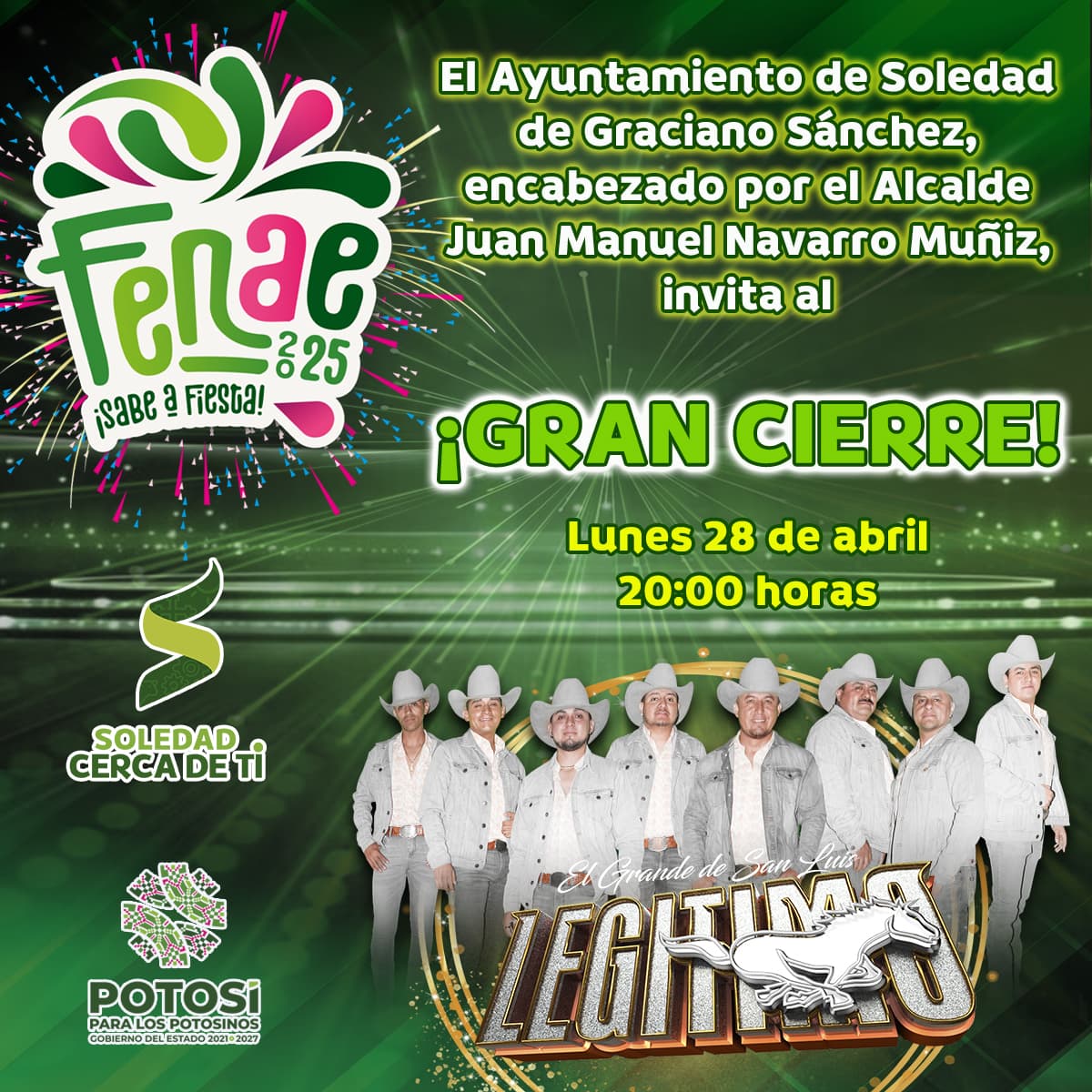 La Feria Nacional de la Enchilada (FENAE) 2025 llegó a su último día de emocionantes actividades musicales, artísticas, gastronómicas y culturales, en las que familias enteras locales, nacionales e internacionales han disfrutado de una variedad de atractivos en un ambiente de paz y tranquilidad, y este décimo día, el Alcalde, Juan Manuel Navarro Muñiz invita a toda la población a ser parte del gran cierre, con la presentación musical del orgullo musical potosino, Grupo Legitimo.