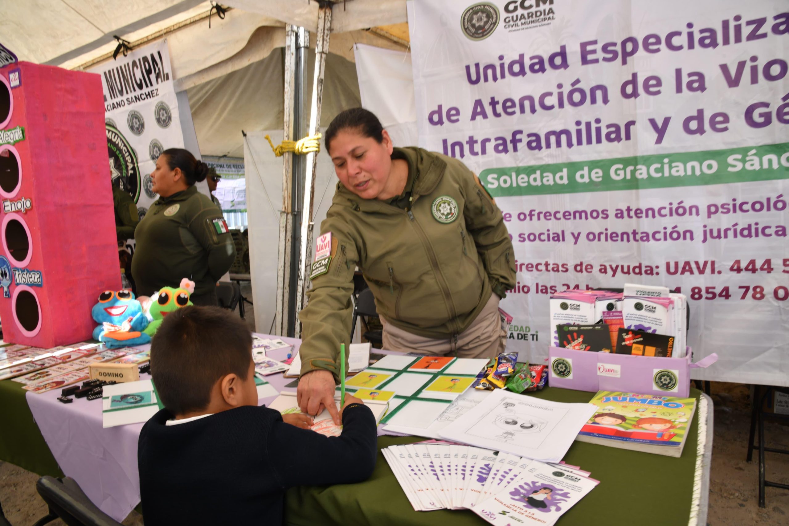 • Guardia Civil Municipal de Soldad de Graciano Sánchez acercó a la colonia San Antonio una Feria de Seguridad con actividades para niñas y niños, orientación para adultos y atención directa a familias, para fortalecer la prevención del delito.
