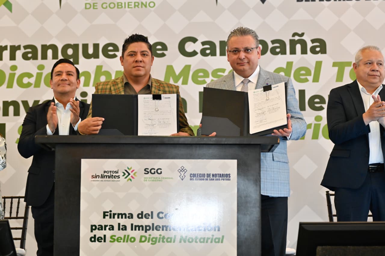 Para brindar mayor certeza jurídica a las y los potosino, el Gobernador de San Luis Potosí, Ricardo Gallardo Cardona, encabezó el arranque de la campaña “Septiembre a diciembre meses del testamento”, así como la firma de convenio para la implementación del sello digital notarial, con el que se garantiza a la ciudadanía que todos sus trámites ante el notario se realicen conforme a derecho, con voluntad de las partes involucradas y con efectos legales justificados.