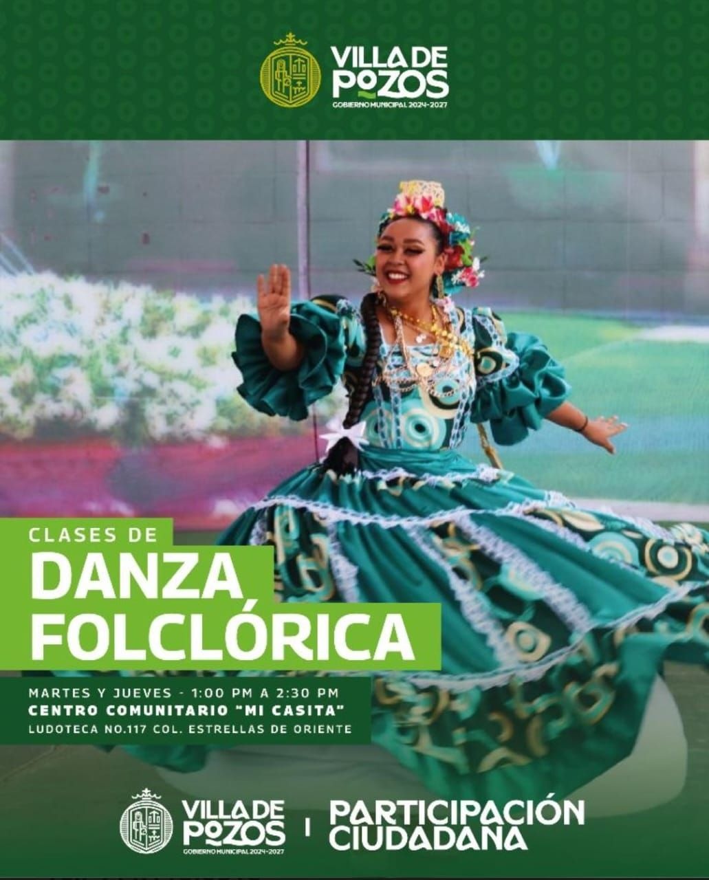 El Gobierno Municipal de Villa de Pozos, a través de la Dirección de Participación Ciudadana, implementará clases de danza folclórica en el centro comunitario “Mi Casita”, con el objetivo de preservar y difundir el patrimonio cultural mediante el movimiento y la expresión corporal.